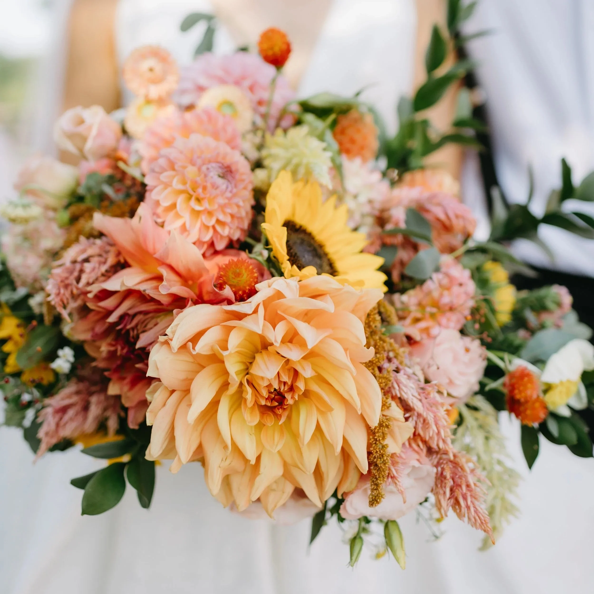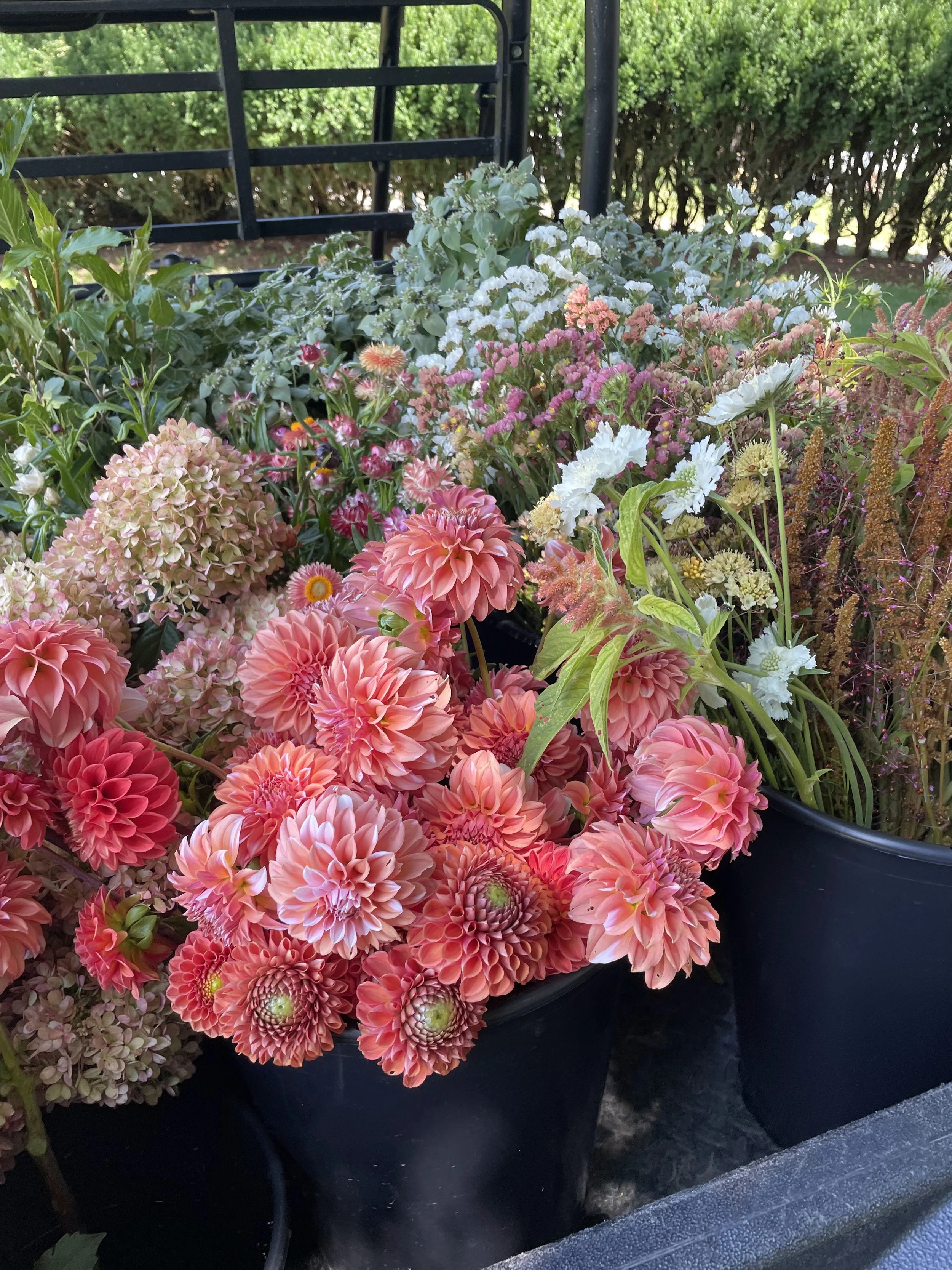 Dahlias, lisianthus, sunflowers, feverfew, , celosia, gomphrena, snapdragons, amaranth, eucalyptus, cosmos, zinnias, dianthus, strawflower